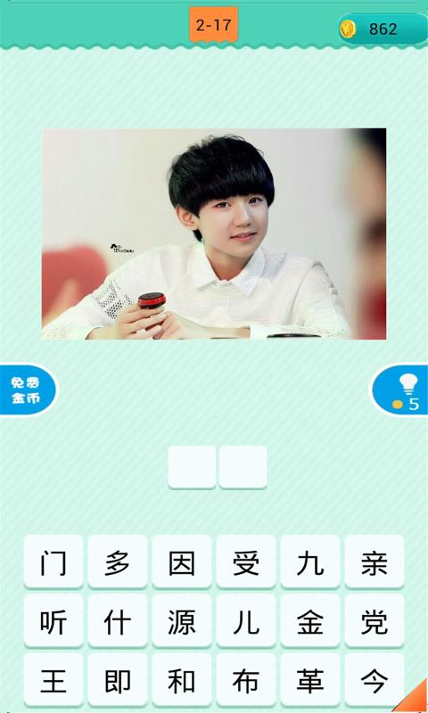 游戏玩法:该游戏非常简单轻易上手,只需根据提供的图片,猜出正确的明星名字,选择正确的文字答题即可,赶紧来挑战通关!!!