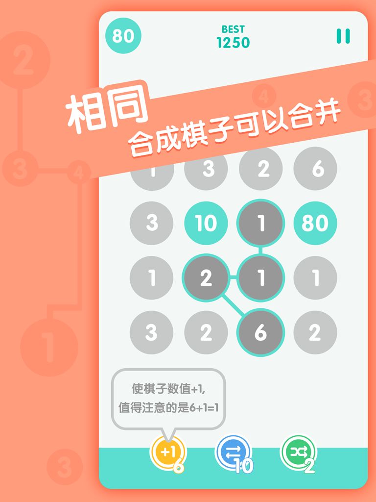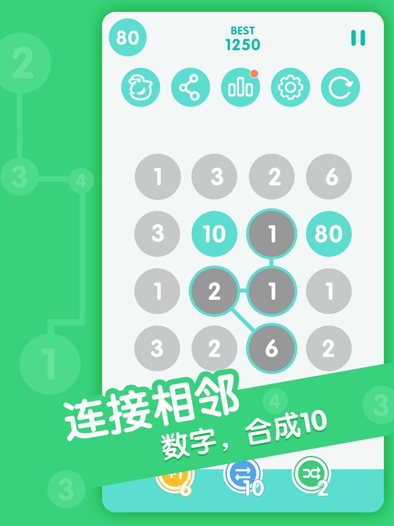 将数字任意方向相连,使得总和为10即可合并为一。