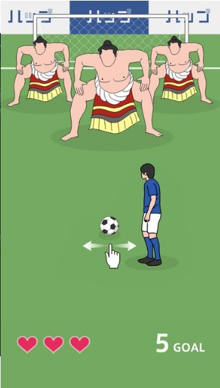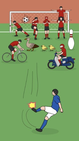 本来是很寻常的点球游戏,因为一群奇葩后卫变得有趣起来。各种路人骑着自行车摩托车就来挡道了,动车也开过来了,棒球手也来捣乱,甚至鸡鸡鸭鸭也慢吞吞地走过。人墙君你们这是闹哪样!无论如何,作为顶尖的罚点球高手,你要在三次机会下闯过更多的关卡。