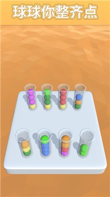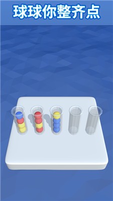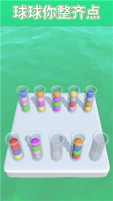 球球你整齐点是一款休闲益智类型的手机小游戏,玩家在游戏中为了能够让自己获得更多的欢乐,一定要正确归类所有的球球。主要的玩法也是相当简单的,一开始玩家将会面对随机放置的球球在不同的桶里面,而玩家需要做的就是将它们进行合理归类,每一个桶里面都放同一种颜色的球球,成功即可宣告游戏胜利。