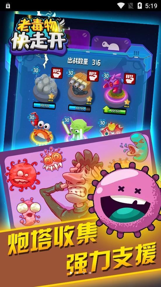 老毒物快走开是一款玩法创新有趣的休闲益智类手游。这款游戏有着非常新颖的游戏玩法,玩家在这里扮演的是一个个强大的细胞,你需要想尽办法抵御病毒的攻击,保卫人体的安全,只有人体安全你们才能生存,需要在人体内建设防御工事,利用塔防来阻止病毒的攻击。