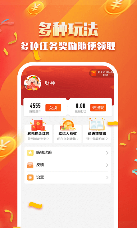 新用户首次登陆立即赠送1000金币奖励,首页内每天还可以免费领取金币,金币可兑换现金,立即入账.
