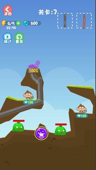 拯救花果山是一款休闲益智游戏。在游戏中救出被困花果山的猴子们。游戏要求玩家灵活使用物品来击败入侵的怪物。游戏的关卡很多,设计也很有趣。你可以用你的手指挖通地球,引导熔岩流出,保护自己和伤害怪物。是一款不错的消磨时间游戏,感兴趣的玩家快来下载试试吧。