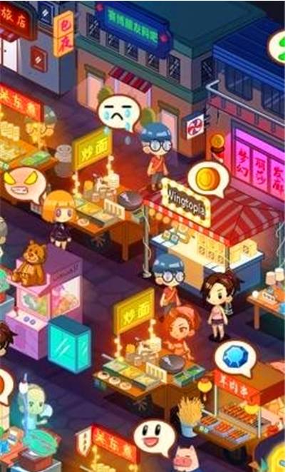 游戏采用了卡通风格的画面设计,色彩鲜艳且细节精致,为玩家营造出一个充满活力和趣味的夜市环境。